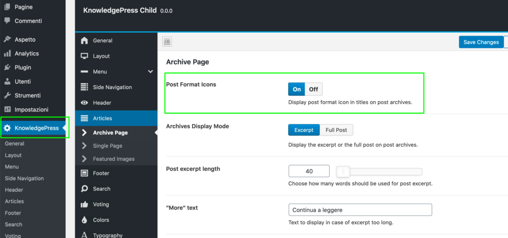 Per attivare la navigazione Breadcrumbs (sono dei link di navigazione che riproducono il percorso disegnato dal sito web e consentono all’utente di capire dove si trova) andare in KnowledgePress > Articles e selezionare ON/OFF nella prima opzione “Display Breadcrumbs”