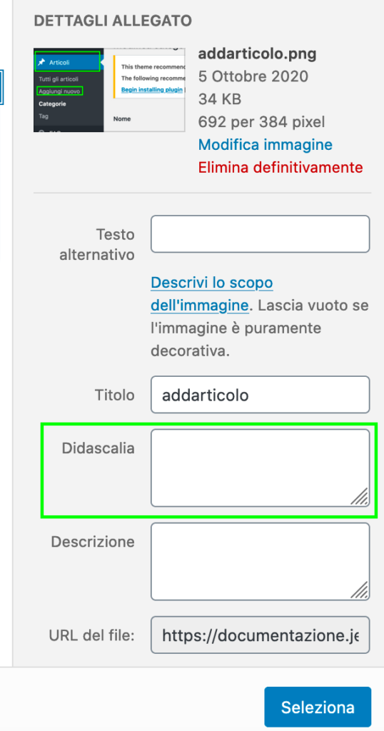 Per inserire una DIDSCALIA sotto ad un IMMAGINE selezionare l’immagine da caricare (vedi guida caricamento immagine) e nel pannello di gestione della singola immagine COMPILARE IL CAMPO DIDASCALIA