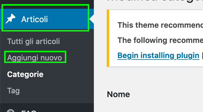 Per creare un NUOVO ARTICOLO andare in Articoli (colonna di sinistra) e cliccare su AGGIUNGI NUOVO