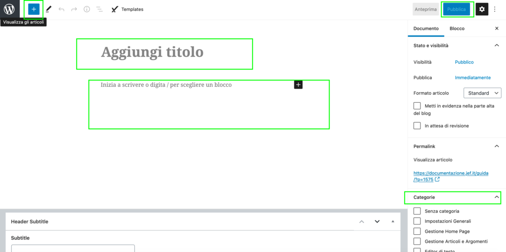 Compilare la scheda dell’articolo impostando TITOLO, CONTENUTO, CATEGORIA DI APPARTENENZA, e le varie opzioni di visualizzazione e cliccare PUBBLICA in alto a destra una volta terminato l’inserimento.
