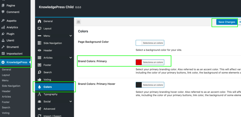 Per impostare il COLORE PRIMARIO della Documentazione andare in KnowledgePress poi in COLORS e selezionare il colore desiderato in Brand Colors: Primary poi cliccare SAVE CHANGES in alto a destra.