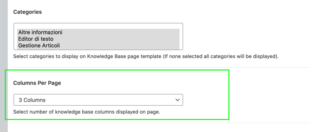 All’interno dell’editor di modifica della pagina scorrere in basso e selezionare nel campo COLUMNS PER PAGE il numero di colonne da mostrare.
