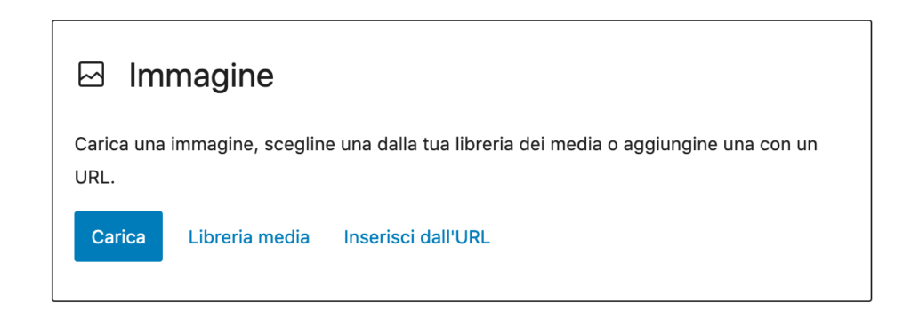 Per caricare un immmagine nell’editor cliccare sul simbolo + in alto a sinistra (quadratino blu) e selezionare l’elemento IMMAGINE tra quelli presenti nella sezione MEDIA