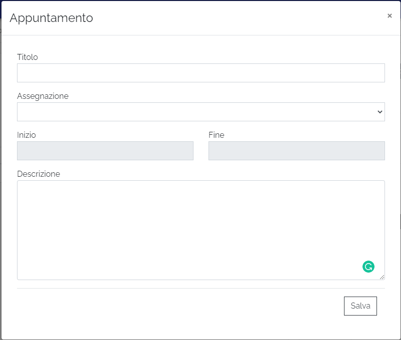 Una volta attivato si apre una nuova schermata che permette di inserire tutte le informazioni necessarie per fissare un nuovo appuntamento: fornirgli un titolo, assegnarlo a un determinato professionista, identificare la data e l’orario sia di inizio che di fine, fornire una piccola descrizione o promemoria per gli interessati dall’evento.