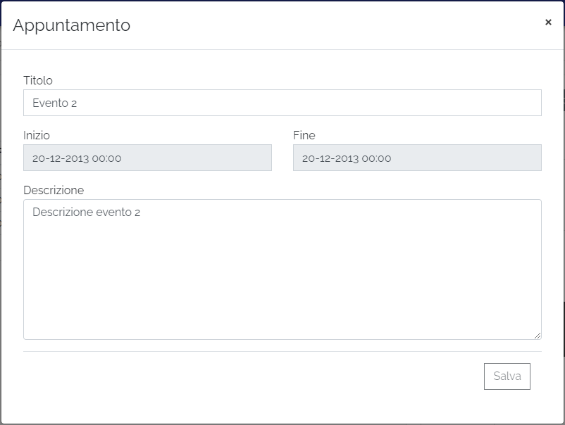 Cliccando sopra l’evento si apre una finestra con le specifiche e dove è possibile anche apportare modifiche all’appuntamento stesso.